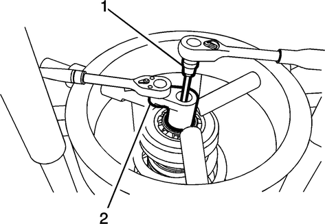 | Use proper size socket to hold front suspension strut shaft while loosening front suspension strut shaft nut. |